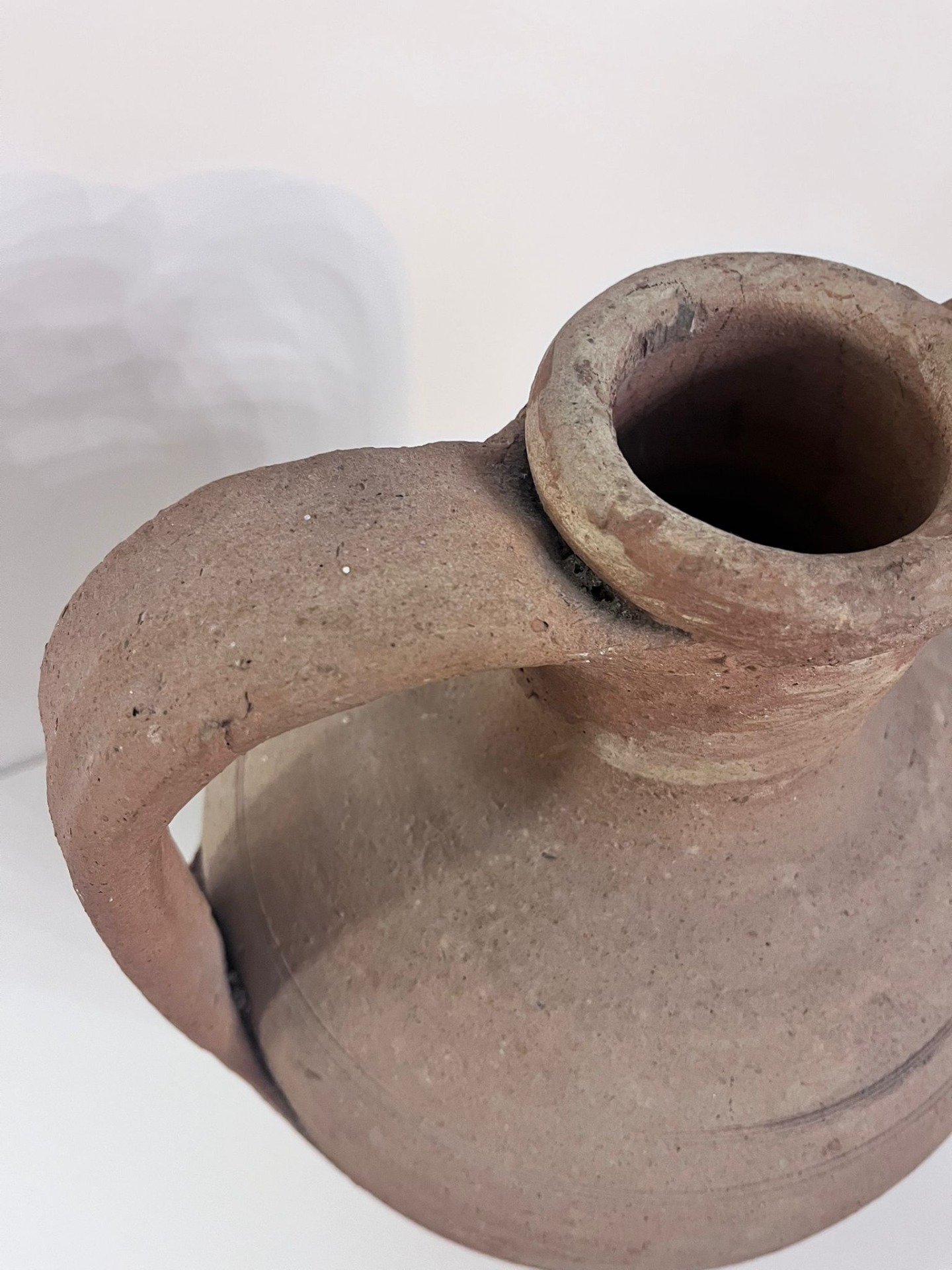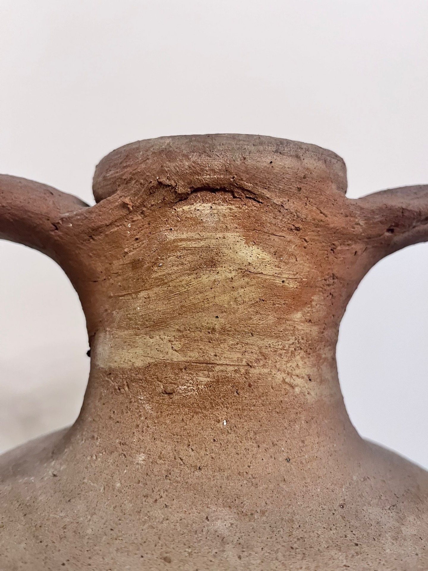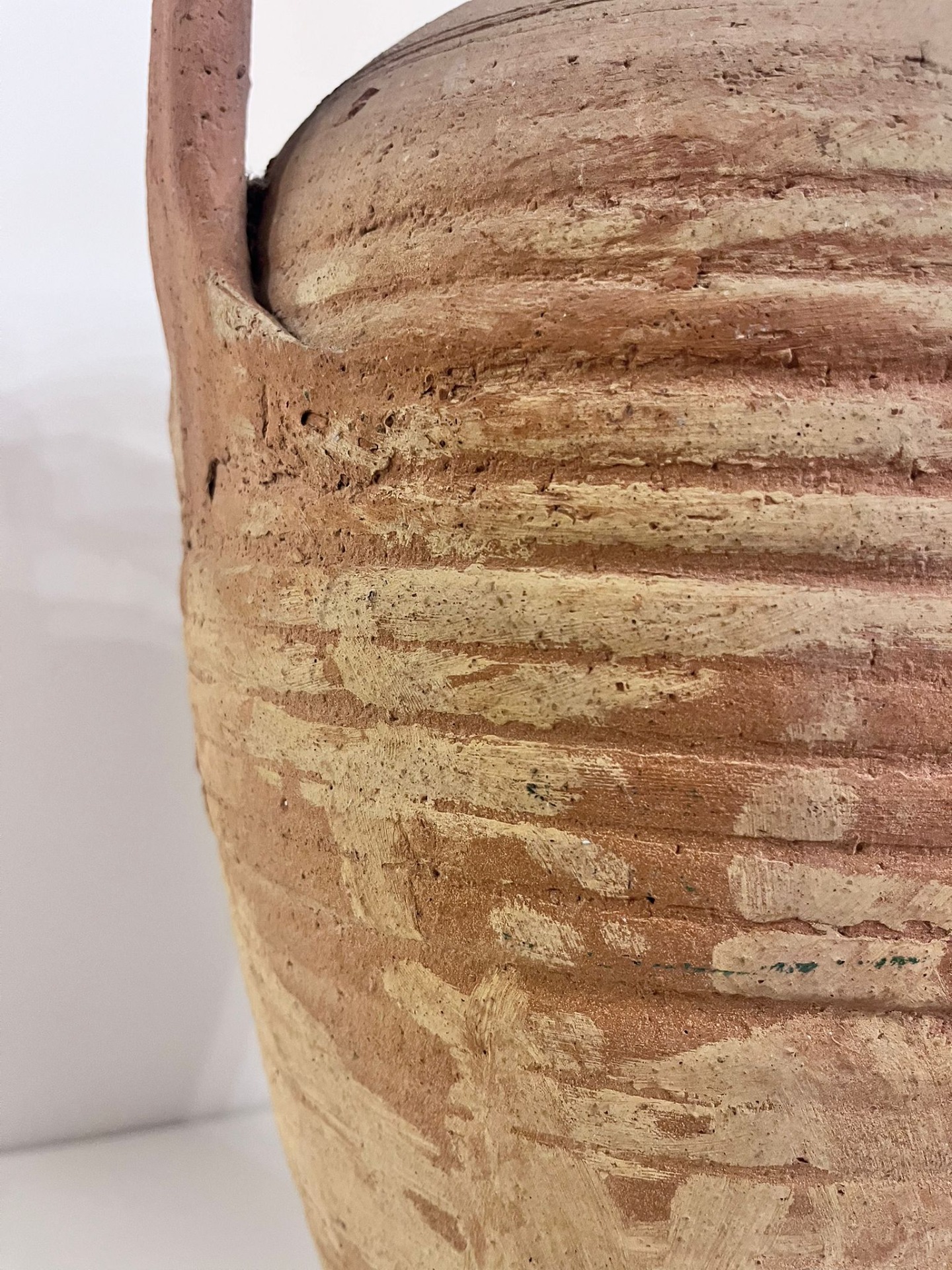Výrazná keramická amfora s robustními uchy a autentickou patinou, která nese stopy času i ruční práce. Tmavší odstín pálené hlíny v kombinaci s přirozeným opotřebením povrchu dodává váze syrový, středomořský charakter a pocit skutečného původu.