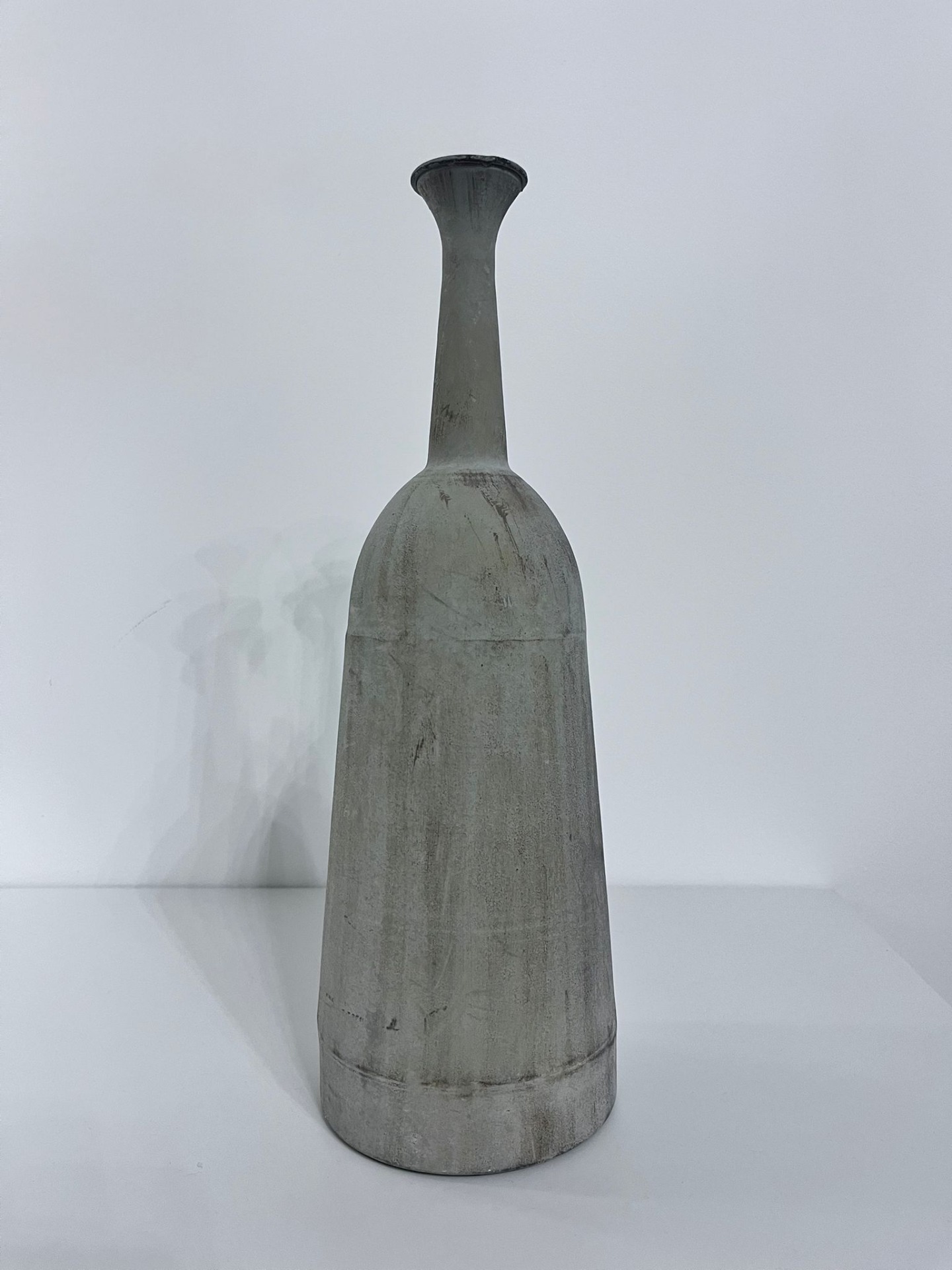 Výrazná kovová váza s protáhlou siluetou a jemně rozšířeným hrdlem působí jako sochařský objekt. Matný, šedý povrch s přirozenou patinou nese stopy času a dodává váze industriální, a přitom velmi elegantní charakter.