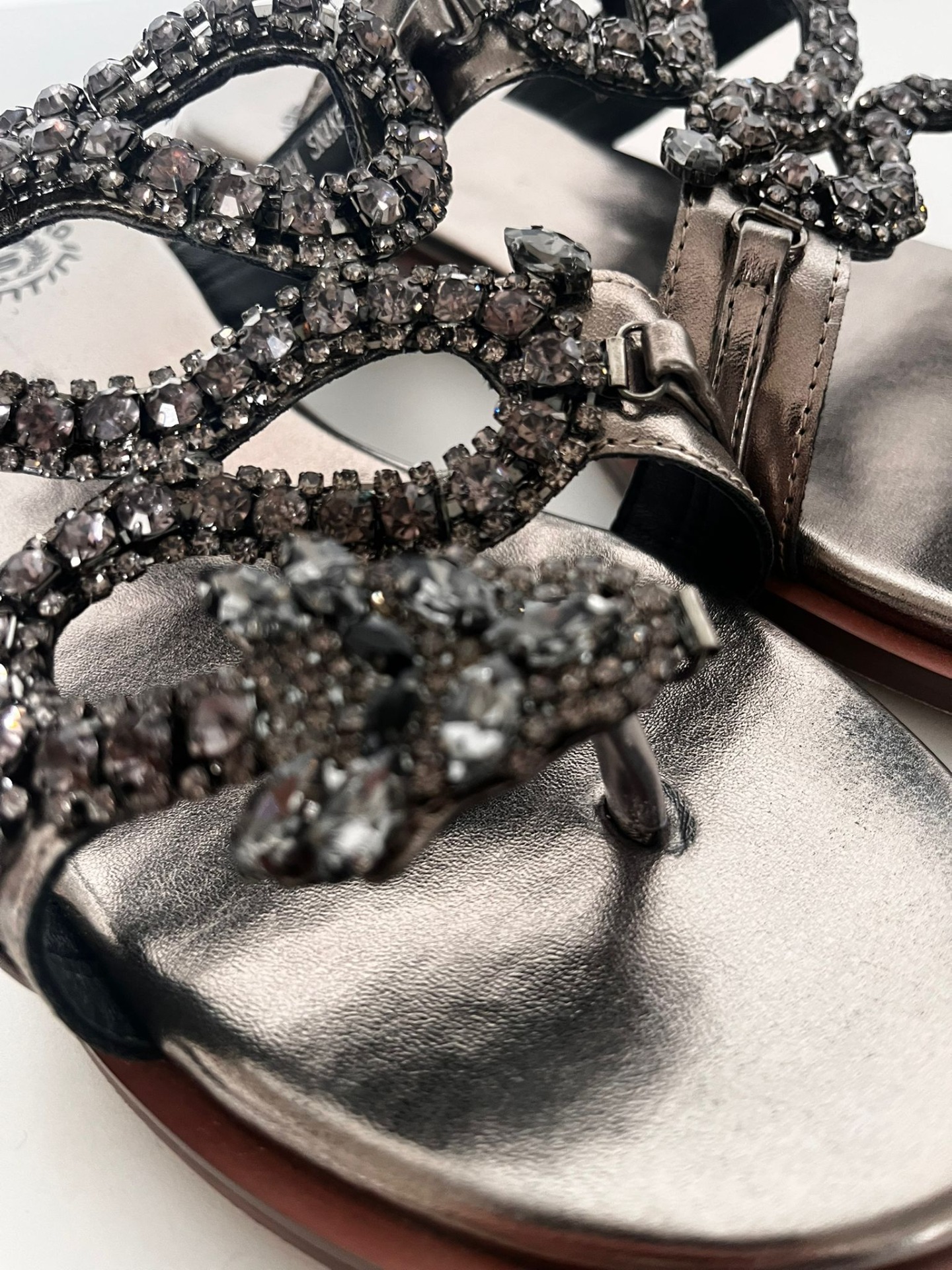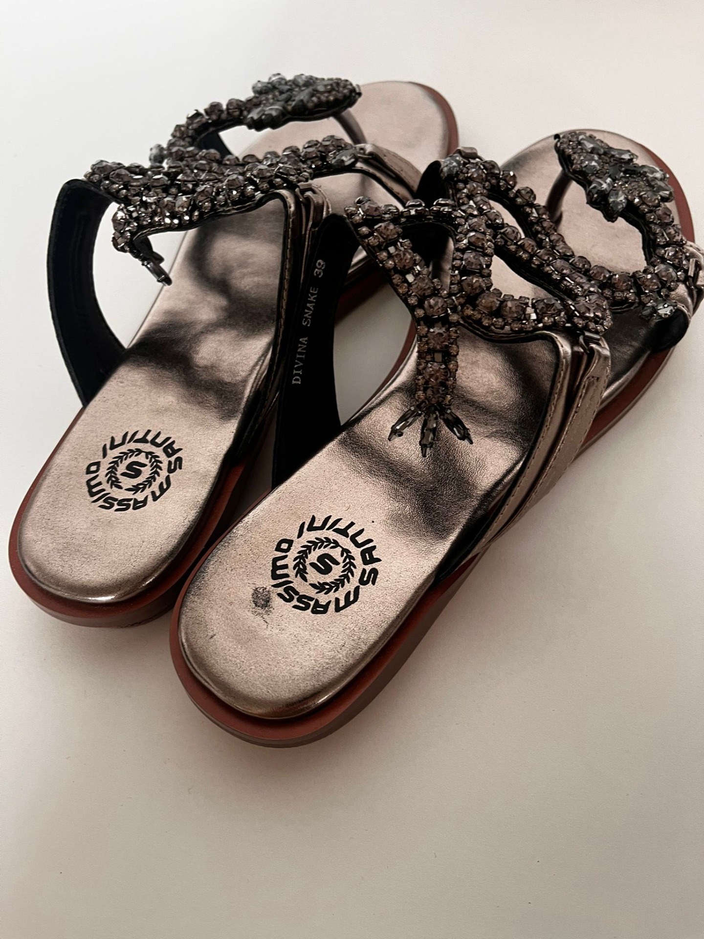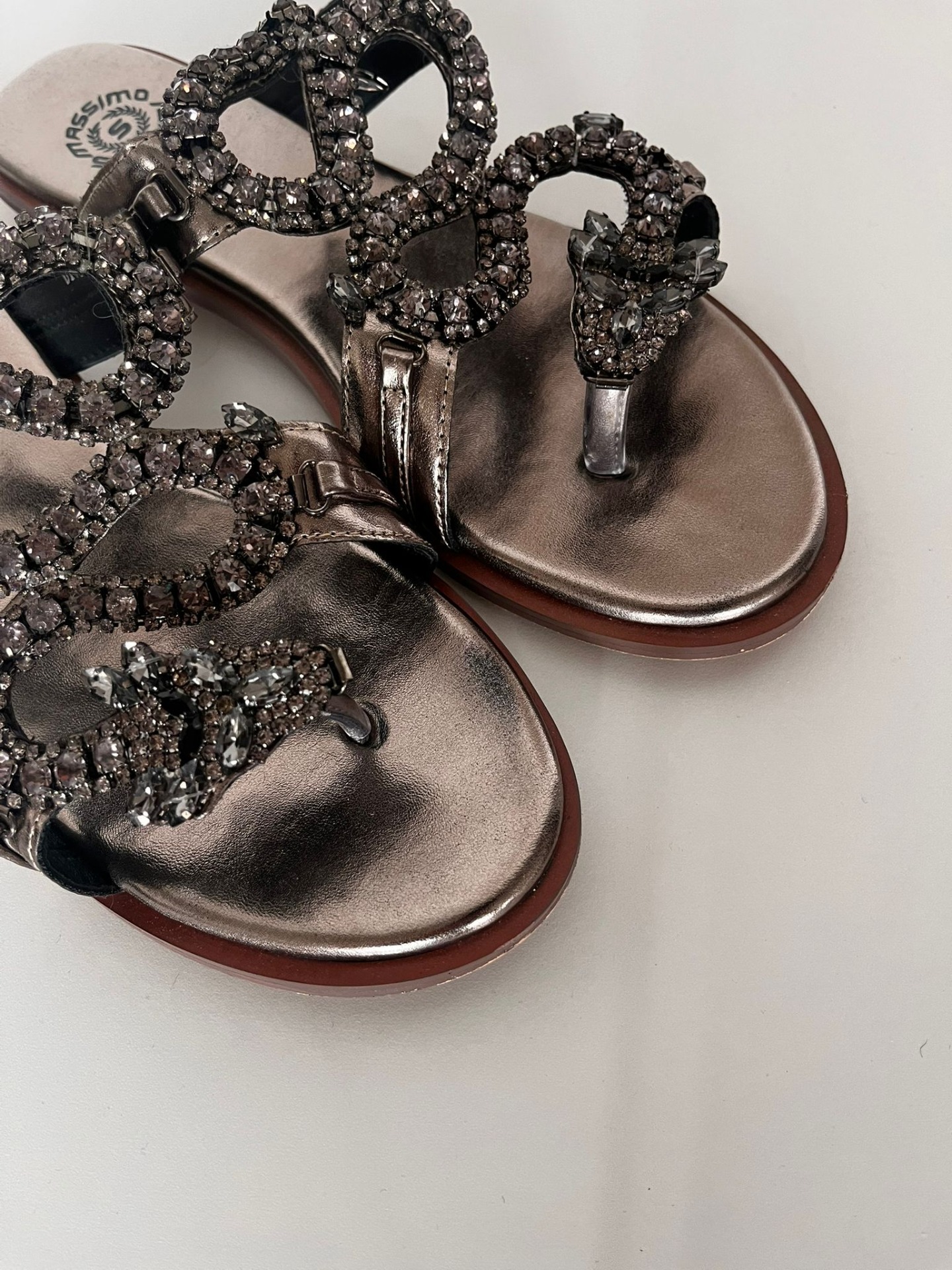 Elegantní sandály značky Massimo Santini zaujmou výrazným zdobením v podobě třpytivých kamenů model Divina Snake, které dodávají modelu luxusní a nepřehlédnutelný vzhled. Metalický povrch stélky podtrhuje sofistikovaný styl, zatímco plochá podrážka zajišťuje pohodlí při každodenním nošení. Ideální volba pro letní outfit, večerní příležitosti i stylové volnočasové kombinace.