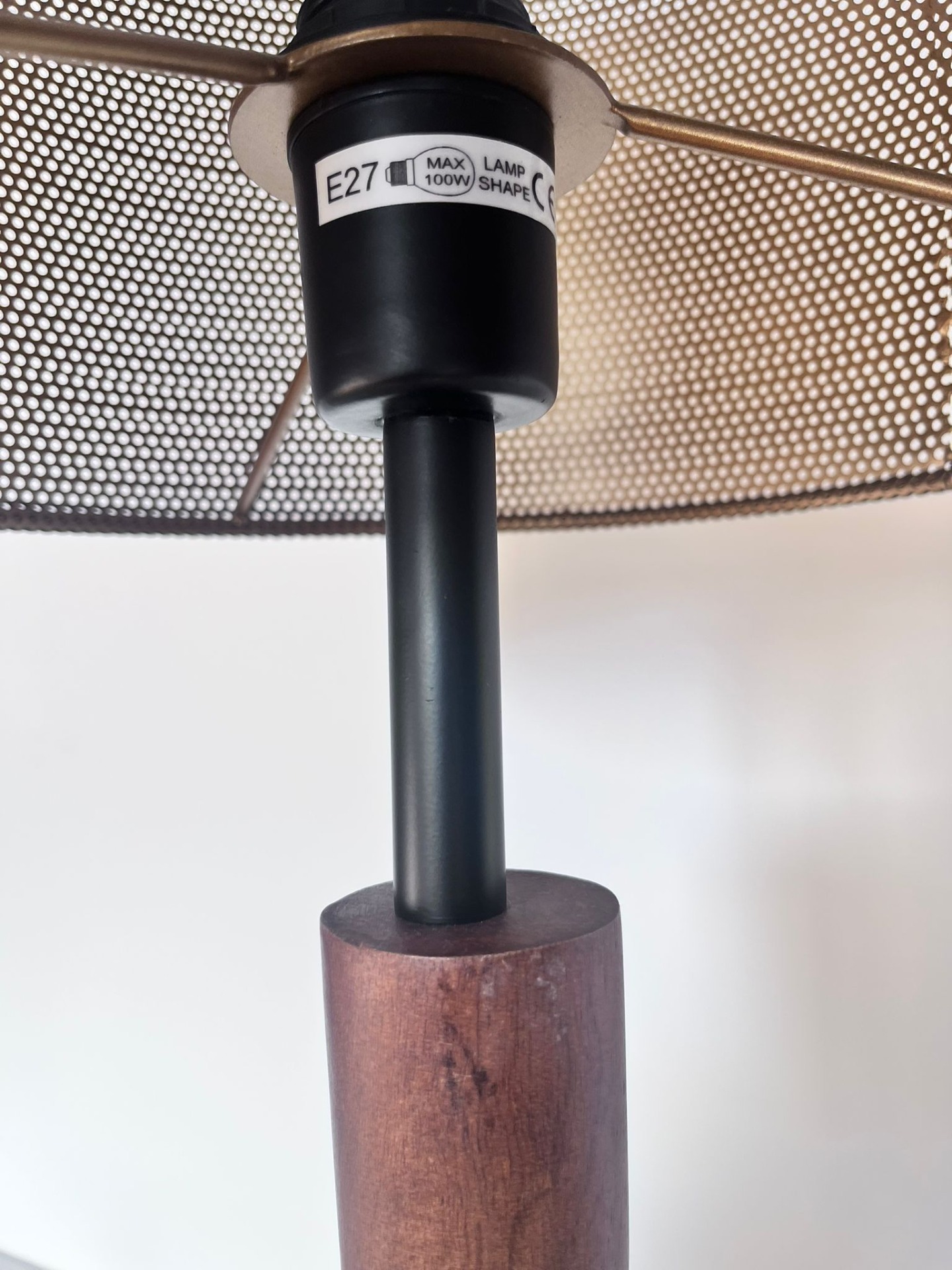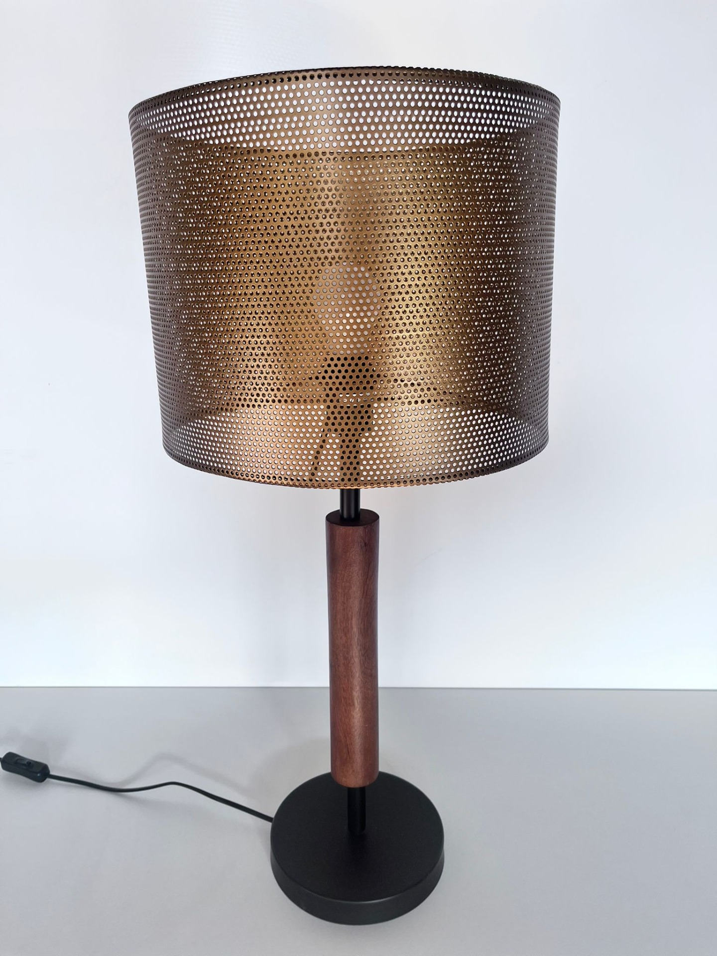 Stylová lampa s dřevěnou nohou a perforovaným kovovým stínidlem v měděném tónu přináší do interiéru hřejivou, lehce industriální atmosféru. Kombinace přírodního dřeva a kovu vytváří vyvážený kontrast mezi jemností a výrazem, který osloví milovníky osobitého designu.
